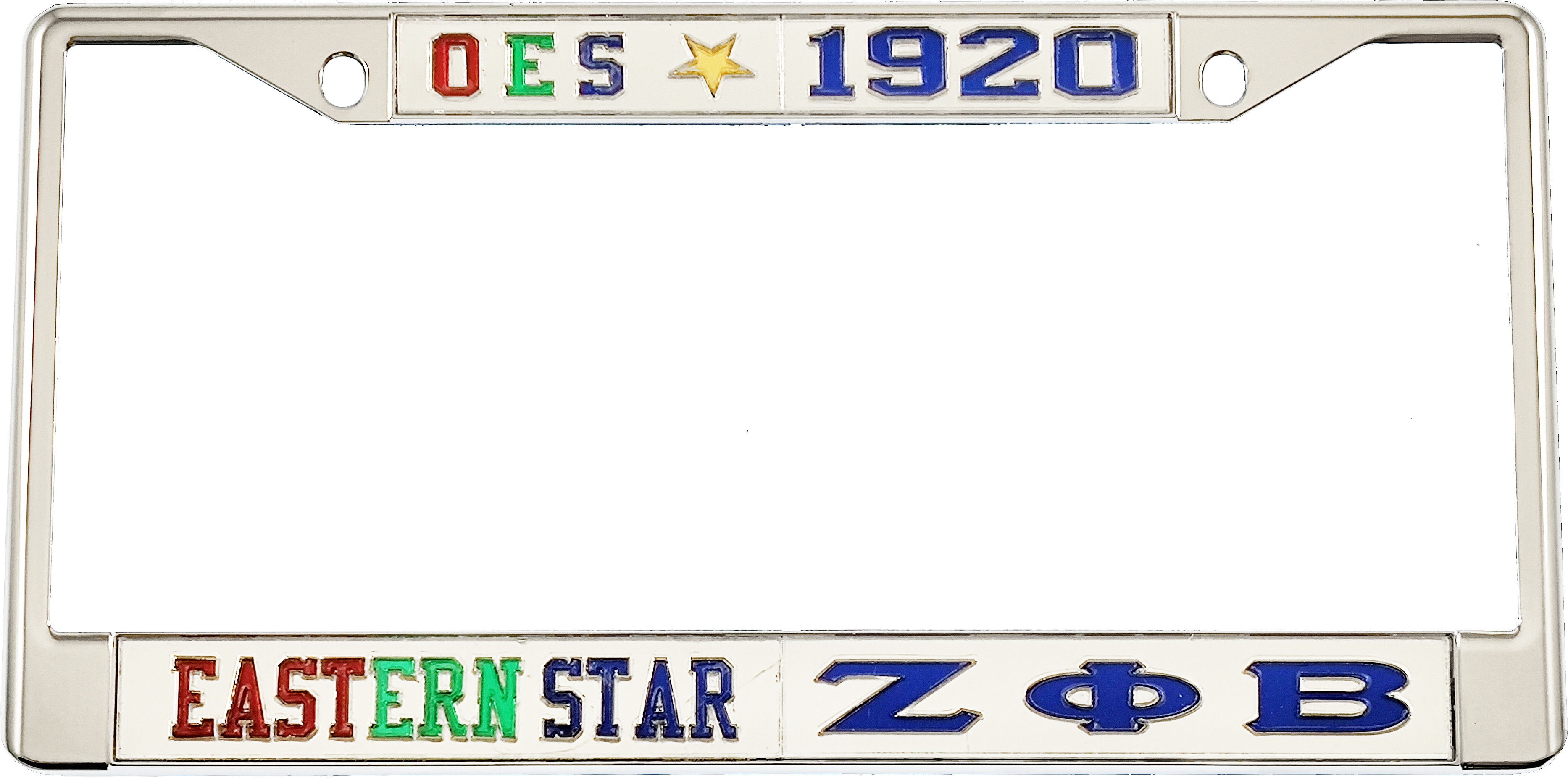This chrome-plated, die-cast metal Split License Plate Frame is designed with colored acrylic inserts featuring a mirrored, reflective surface for two organizations. The text on each frame is laser cut and set into the acrylic inserts. This frame fits all standard U.S. state license plates. It includes two holes at the top for screws and two metal tabs at the bottom to secure the license plate.