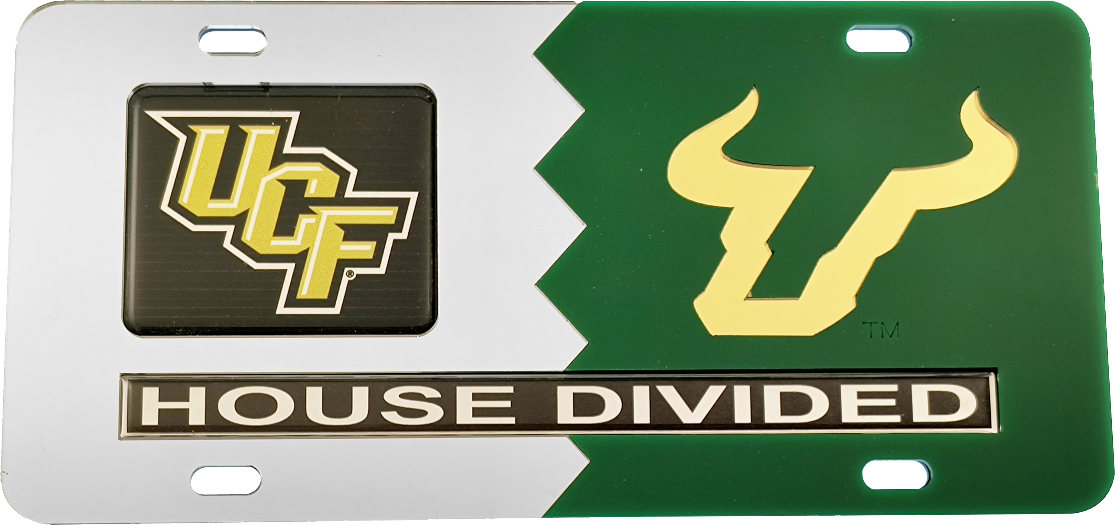 This House Divided Tag is made with a hard acrylic plastic base and a tough top layer of 2 split, mirrored acrylic pieces in contrasting colors, showcasing two collegiate schools. An additional cutout domed acrylic piece with the wording, "House Divided," is displayed on the plate as well. There are 2 holes at the top and 2 holes at the bottom of the license plate for screws.