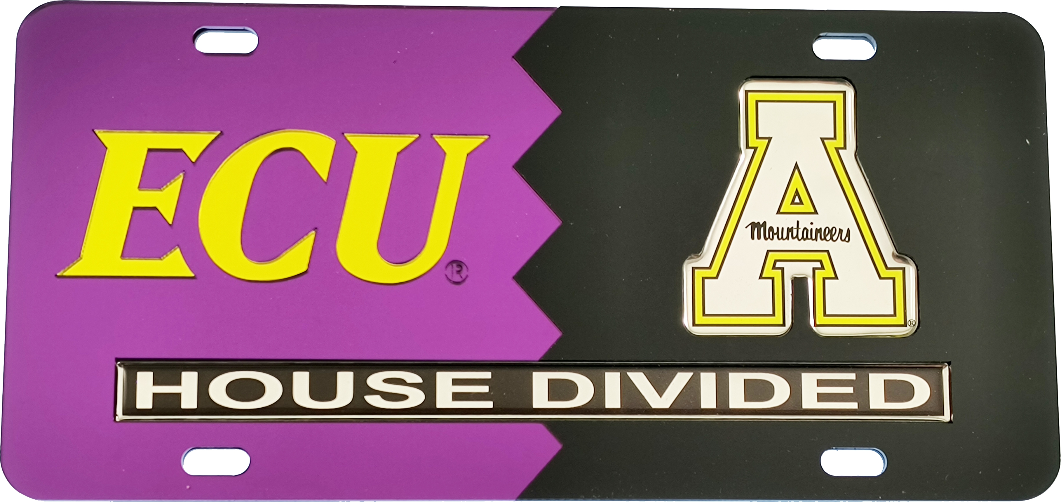 This House Divided Tag is made with a hard acrylic plastic base and a tough top layer of 2 split, mirrored acrylic pieces in contrasting colors, showcasing two collegiate schools. An additional cutout domed acrylic piece with the wording, "House Divided," is displayed on the plate as well. There are 2 holes at the top and 2 holes at the bottom of the license plate for screws.