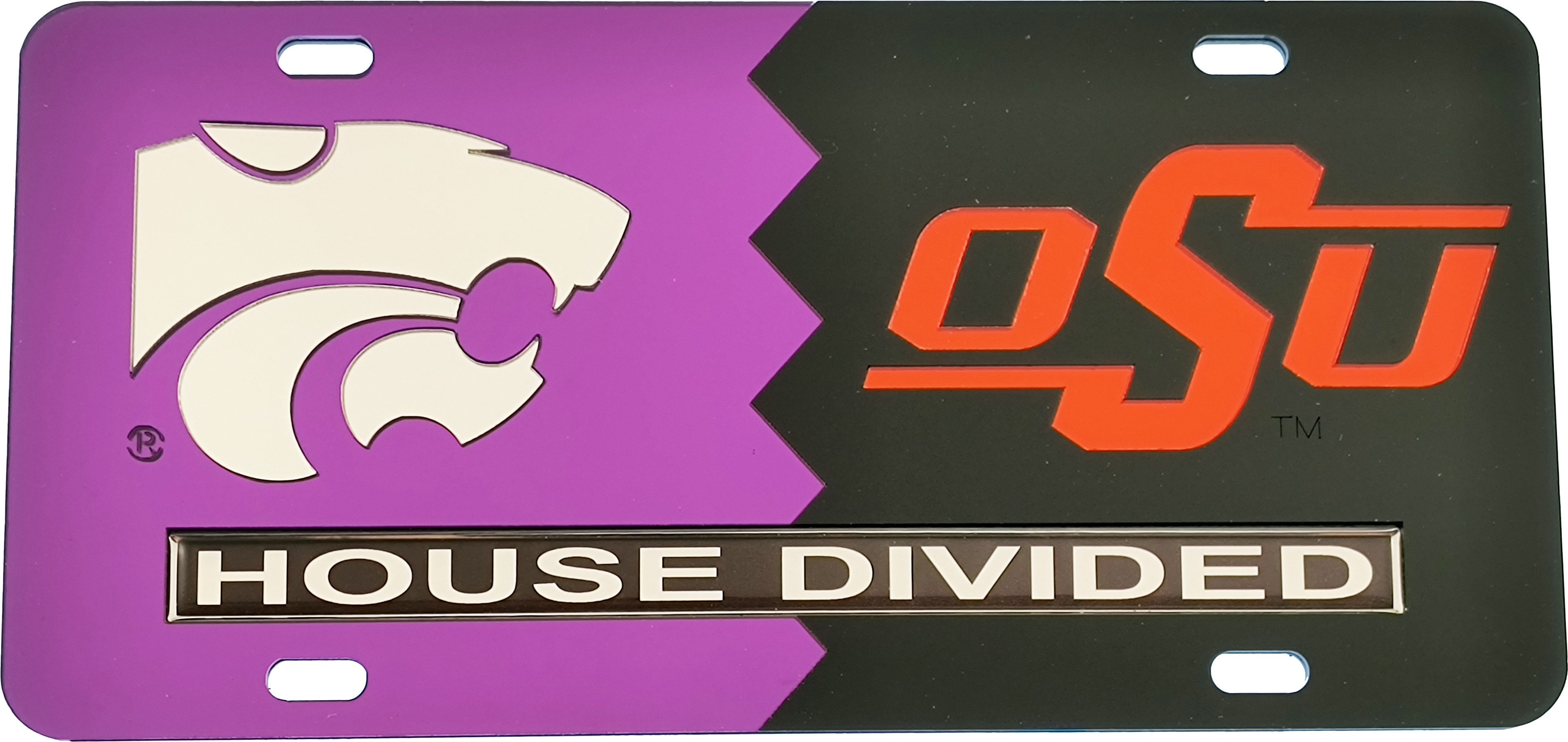 This House Divided Tag is made with a hard acrylic plastic base and a tough top layer of 2 split, mirrored acrylic pieces in contrasting colors, showcasing two collegiate schools. An additional cutout domed acrylic piece with the wording, "House Divided," is displayed on the plate as well. There are 2 holes at the top and 2 holes at the bottom of the license plate for screws.