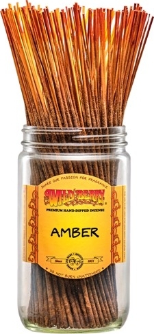 100 hand-dipped Amber incense sticks. A warm amber fragrance with musky notes of cedarwood and soft patchouli.