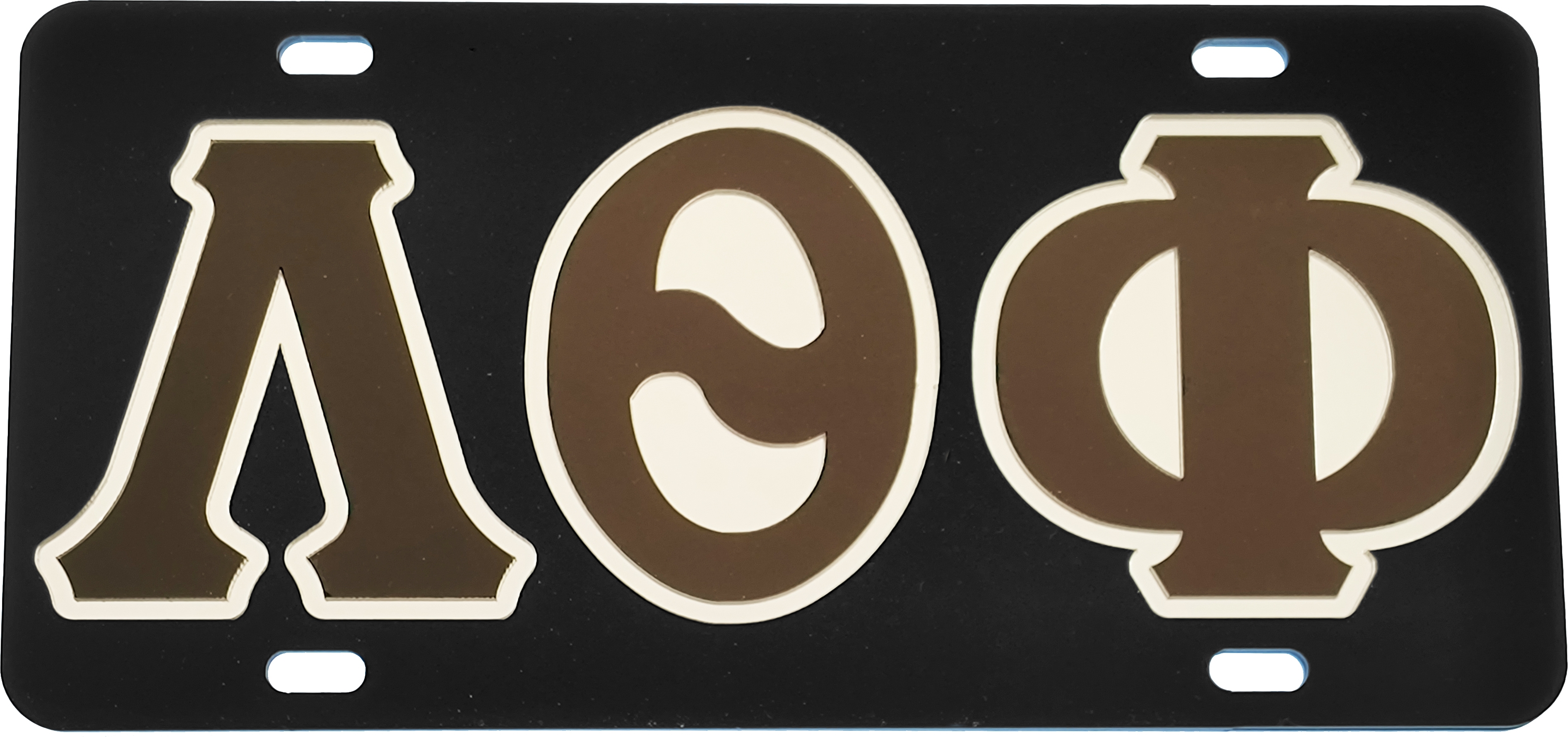 This Colored Mirror License Plate is made with a hard acrylic plastic base that has a tough mirrored acrylic piece on top, with mirrored Greek letters inlaid into it. There are 2 holes at the top and 2 holes at the bottom of the license plate for screws.