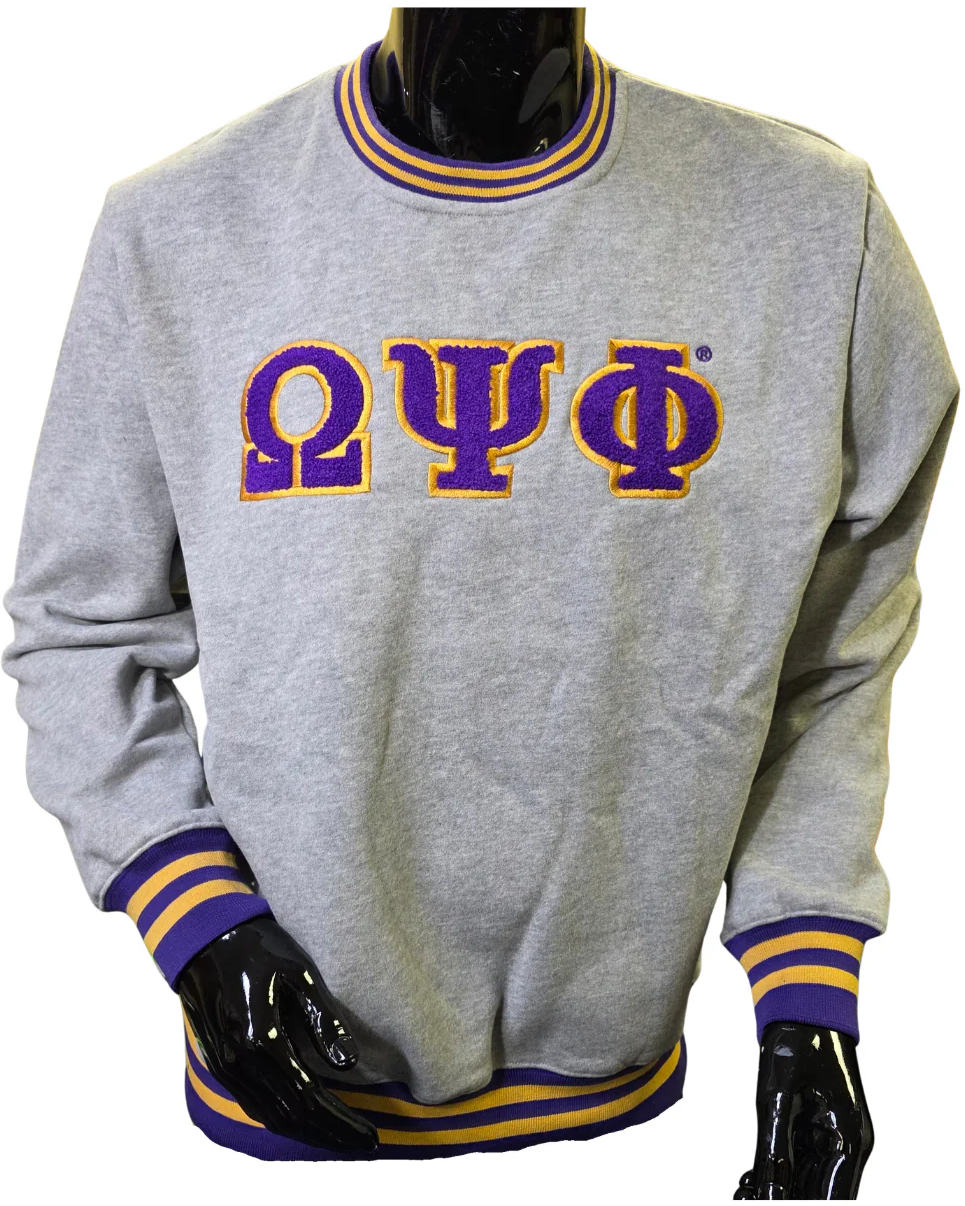 Sweatshirt showcasing embroidered chenille Greek letters, crew neckline for a non-restrictive fit, ribbed collar and cuffs, improve durability