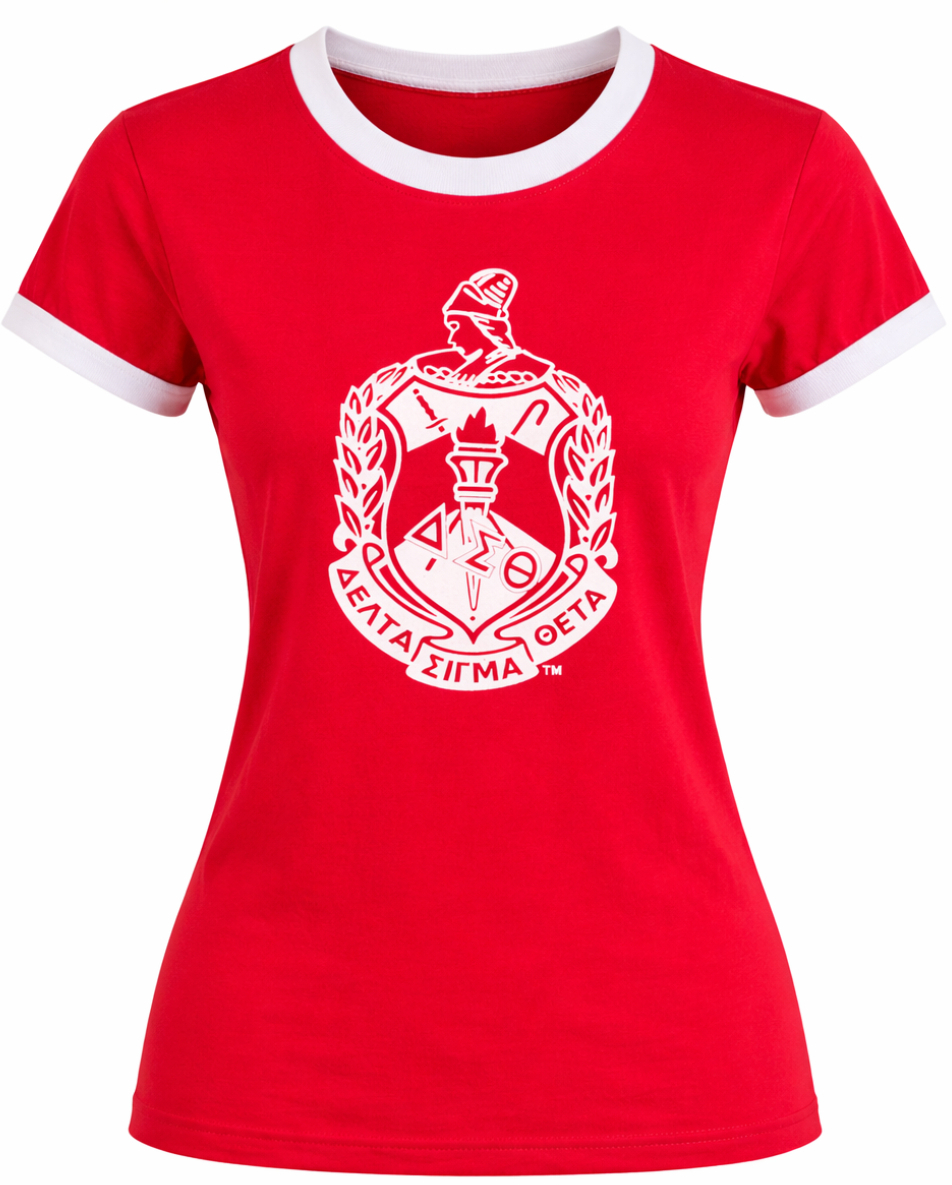 A classic ringer tee featuring a velvety flocked DST® shield for a premium, textured finish. Soft, breathable, and perfect for everyday wear, conferences, or gifting.